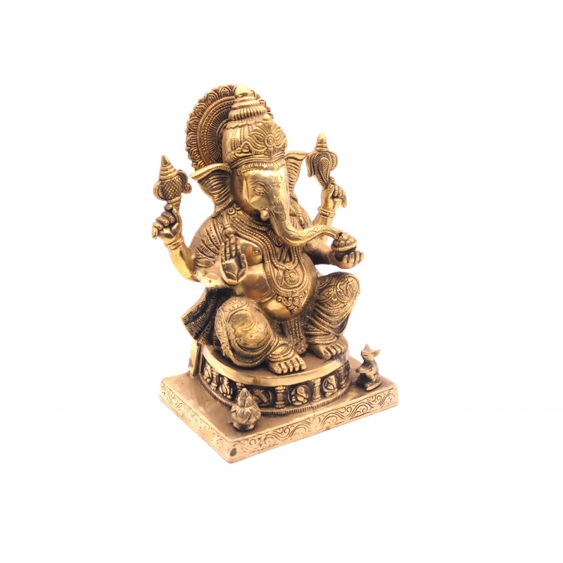 Beautiful Extremely uncommon Carved by hand God Ganesha / Ganesh in sitting position, solid metal brass body Lord Ganesha symbolises joy and happiness, and is thought to bring prosperity and good fortune. Look at his circular tubby, which represents Lord Shiva's offspring, and munch around it. Don't miss the intricate hand carving surrounding the ganesha sculpture. Ganesha in a happy and calm pose. Ganesha carries a goad in his upper right hand, which he uses to urge humans ahead on the endless path and remove impediments. Ganesha's left-hand noose is a compassionate tool for capturing all obstacles. The rosary in his other hand symbolises that knowledge should be pursued indefinitely. The laddoo (sweet) he carries in his trunk denotes the need to uncover the Atman's deliciousness. He is the Lord of Success and the Remover of Obstacles and Evils. He is also revered as the god of education, learning, wisdom, and wealth. Ganesha is one of the five major Hindu gods (the others being Brahma, Vishnu, Shiva, and Durga) whose worship is celebrated as panchayatana.