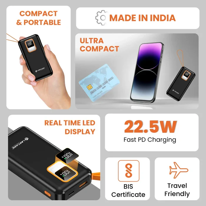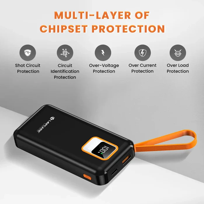 Unstoppable Power: LAPCARE ORANGE portable power bank is powered by advanced Lithium Polymer Battery, delivering a whopping 10,000 mAh battery capacity to keep your devices charged up.