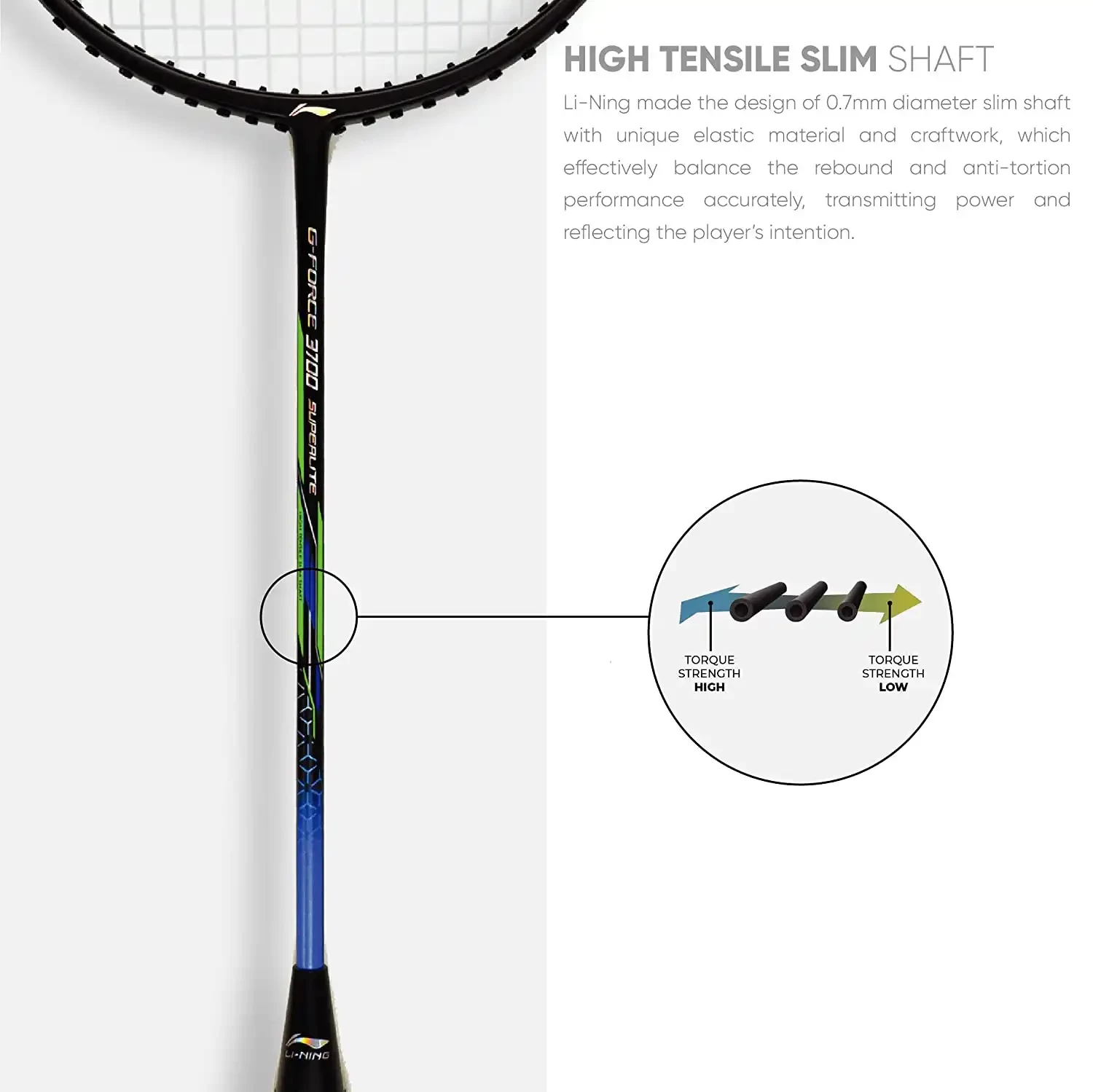 - Li-Ning g force series is made with strong material know as ultra carbon fiber. This material gives excellent rigidity to sustain impact load at very low weight