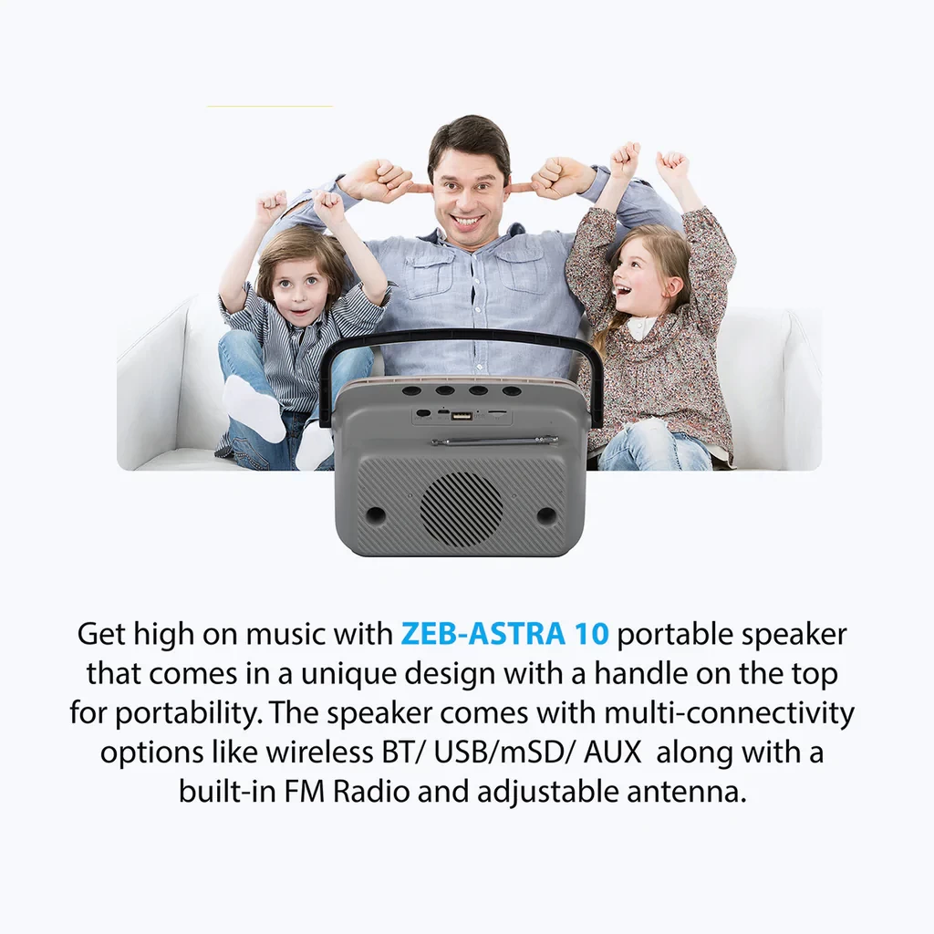 ZEB-Astra 10 is a wireless portable speaker with a unique design that features a handle on the top for portability. The speaker has features like multi-connectivity options like wireless BT/ USB/mSD/ AUX along with a built-in FM Radio and adjustable antenna. It also tags along with a mobile holder so you can place your mobile in the front and listen to your music wherever you go.
