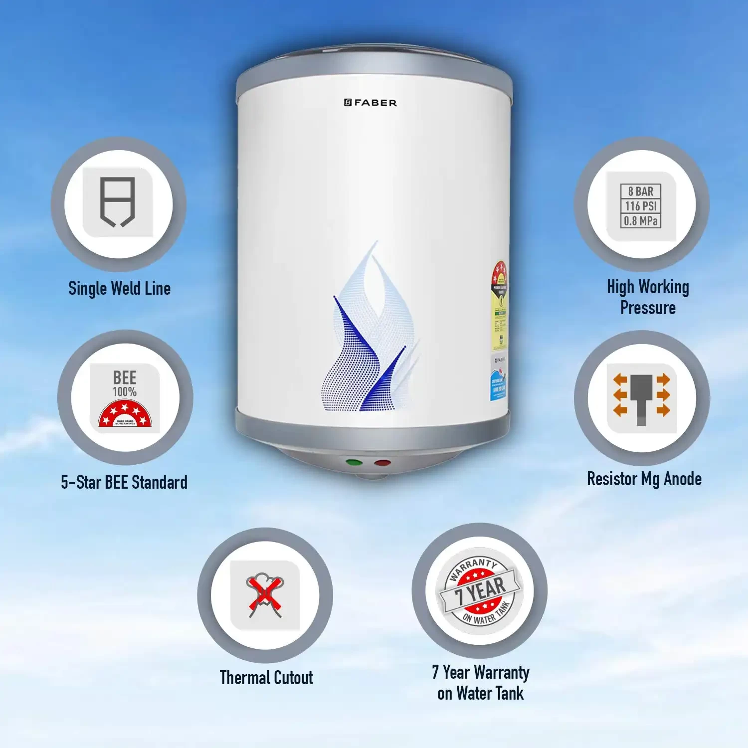 • Tank: Cold reduced low carbon Steel for Longevity, Magnesium Anode Rod for enhanced tank life