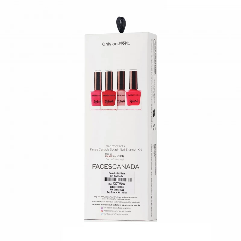 All good things come in small packages! A perfect combo of 4 Splash Nail Enamels, exclusively available on Nykaa. Splash Nail Enamels are mini color bombs which will extend unbeatable color pay off to your nails along with the smooth application. A high-quality chip-resistant formula that smoothly glides to give an attractive and flawless finish. A specially designed round-cut, fan-shaped brush, will give your nail an effortless end-to-end coverage.