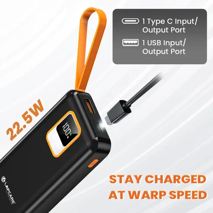 Unstoppable Power: LAPCARE ORANGE portable power bank is powered by advanced Lithium Polymer Battery, delivering a whopping 10,000 mAh battery capacity to keep your devices charged up.