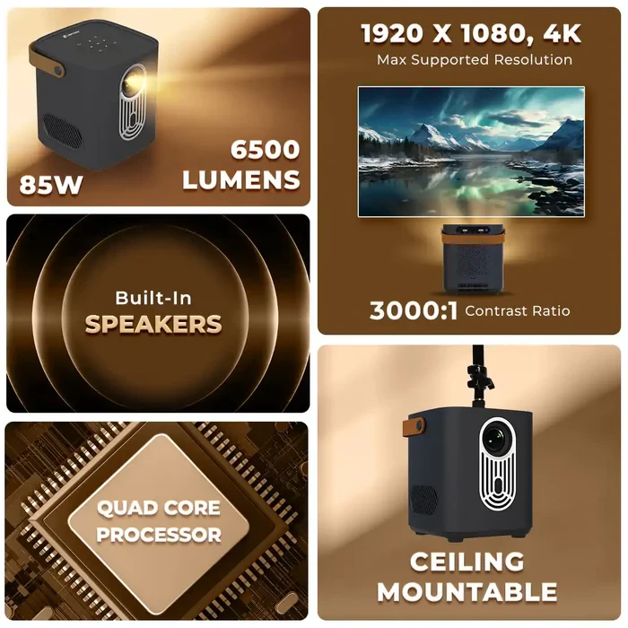 Special feature: 4"LCD fully-sealed Optical Engine NO DUST ENTER, Auto focus, Auto Keystone, Celling mountable , Remote control, Digital Focus , 85W Projector Power, V5.0 BT Version , Easy Setup, LED Lamp, Dual band Wi-Fi (2.4Ghz+5Ghz)